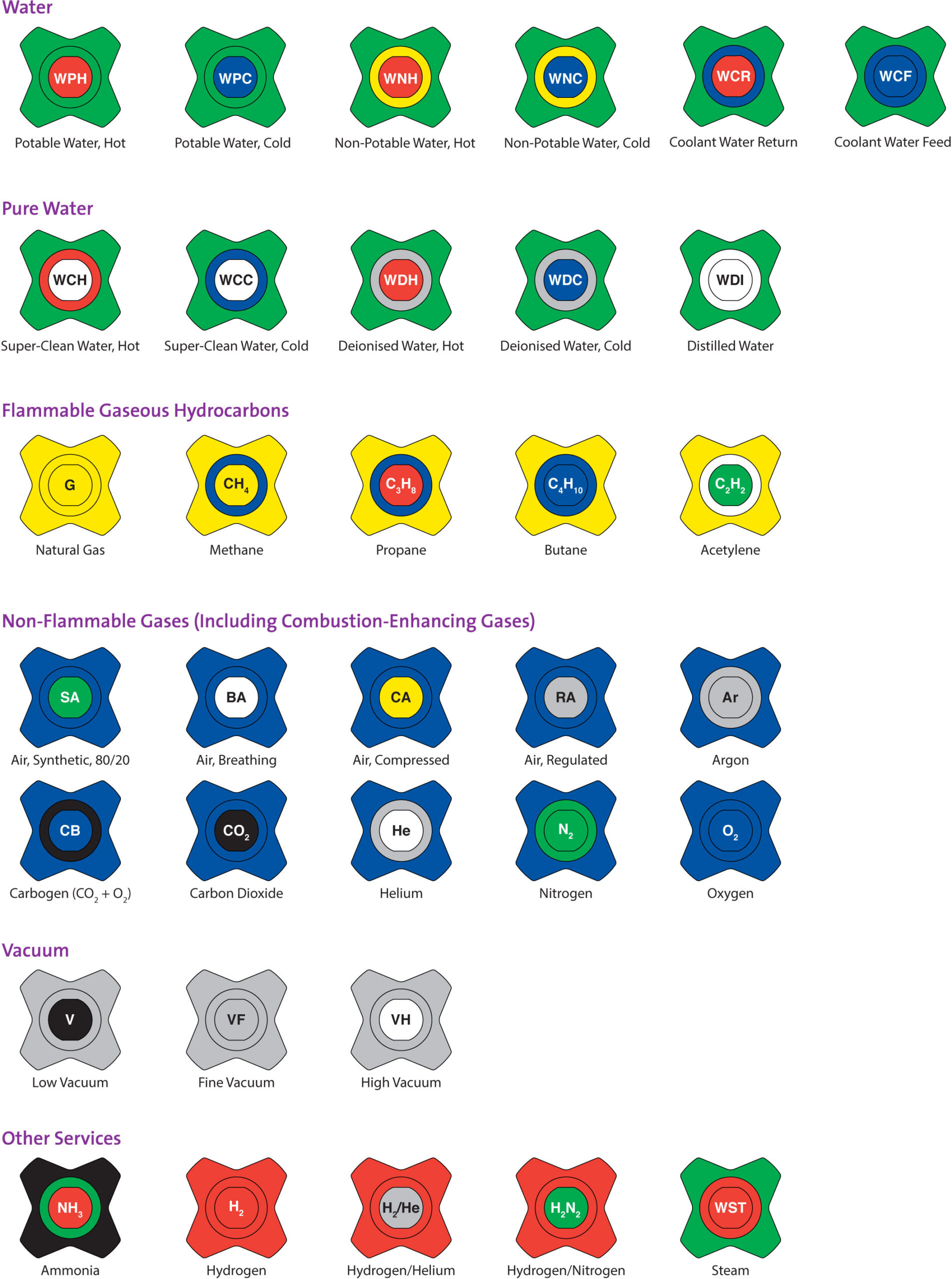 | Non-potable water, cold | Water | WNC | Green | Yellow | Blue |