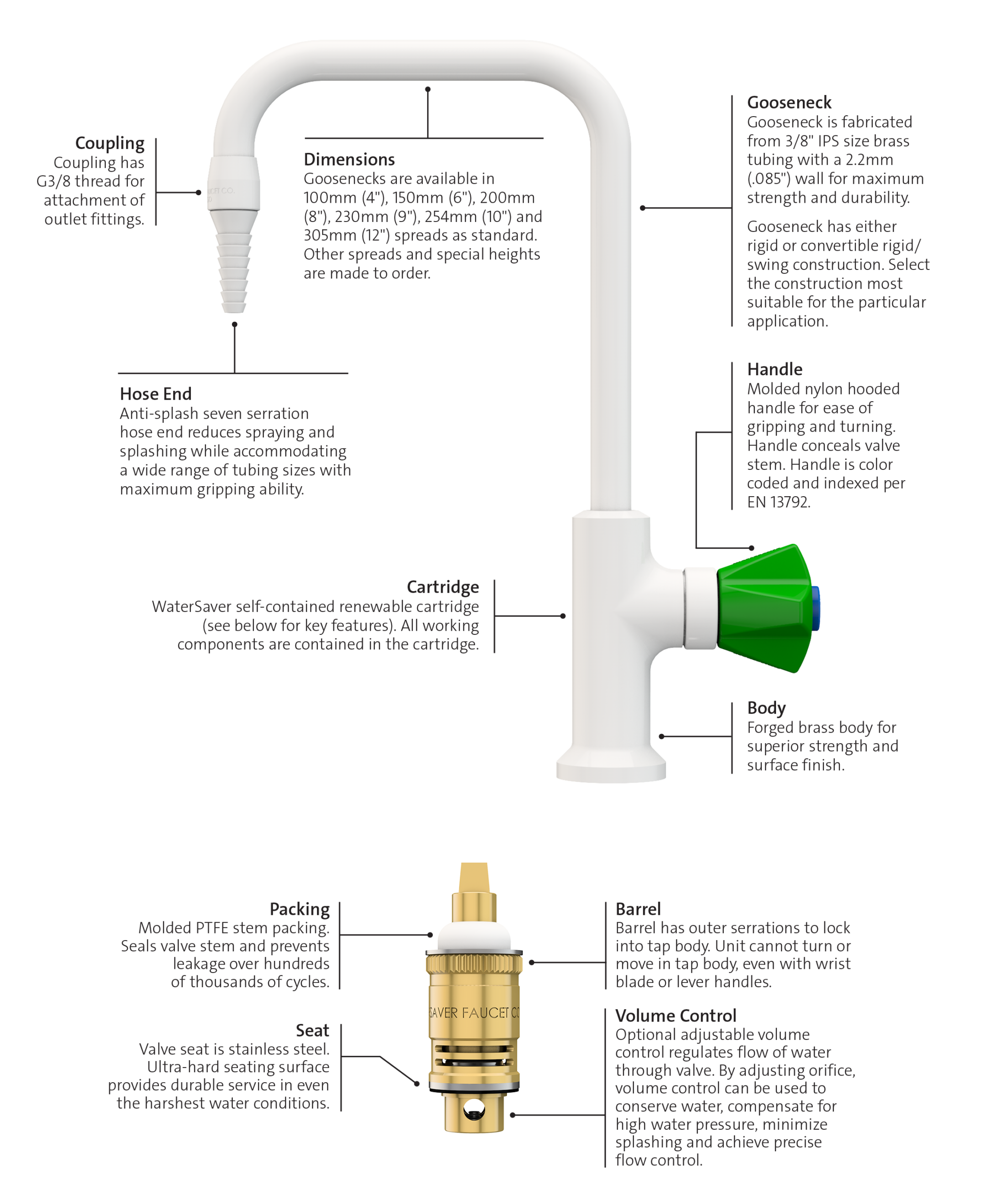 WaterSaver ColorTech BT water fittings utilize an interchangeable renewable unit cartridge which incorporates a replaceable stainless steel seat. Fittings are certified by (i) CSA International to meet the requirements of ANSI/ASME A112.18.1M and CAN/CSA B.125.M89.