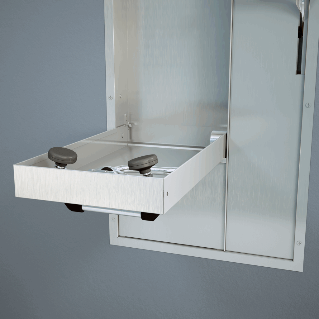 Application: Recessed barrier-free eye/face wash and shower safety station with wall mounted exposed shower head and drain pan. Stainless steel cover provides attractive appearance and protects unit when not in use. When activated, cover serves as pan to collect waste water and return it into unit for drainage.