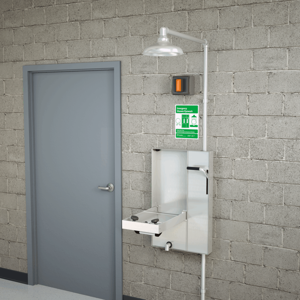 Application: Barrier-free eye/face wash and shower safety station for surface mounting. Unit is ideal for use on concrete masonry unit (CMU) and other walls that cannot be penetrated. Unit has exposed shower head and swing-down eye/face wash with drain pan. Stainless steel cover provides attractive appearance and protects unit when not in use. When activated, cover serves as pan to collect waste water and return it into unit for drainage. Rather than connecting to building drainage system, unit has 1″ IPS stainless steel drain on front of unit for waste water. Front drain eliminates need for connection to drainage system while facilitating regular testing of unit.