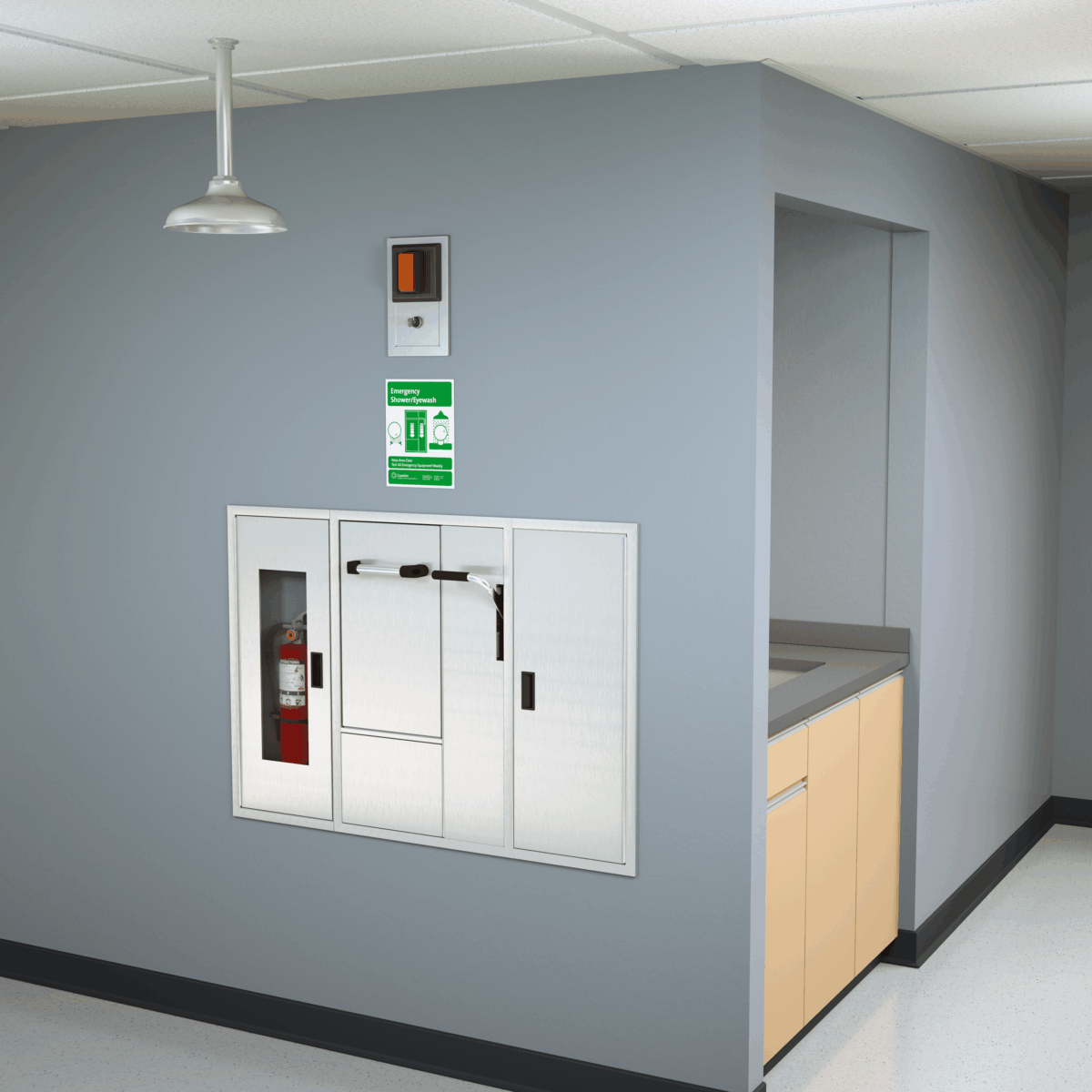 Application: Recessed safety center with barrier-free eye/face wash and shower safety station, matching fire extinguisher and right side storage housings, ceiling mounted exposed shower head, and drain pan. Stainless steel cover provides attractive appearance and protects unit when not in use. When activated, cover serves as pan to collect waste water and return it into unit for drainage. The integrated housings create a cohesive aesthetic for all safety equipment requirements in one location.
