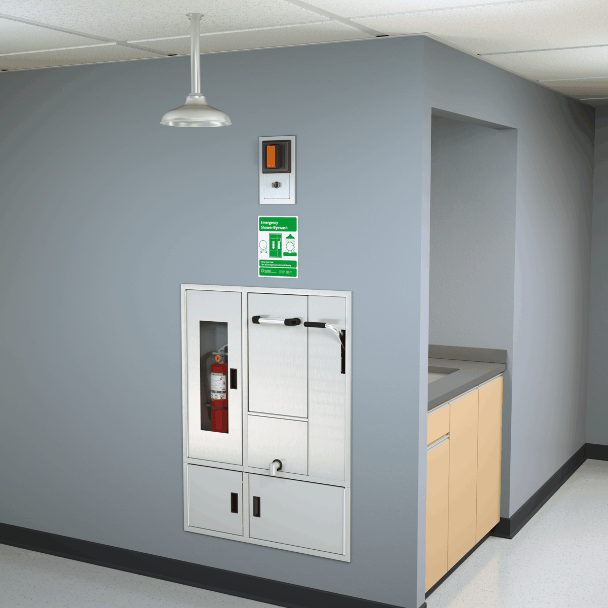 Application: Recessed safety center with barrier-free eye/face wash and shower safety station, matching fire extinguisher and lower storage housings, ceiling mounted exposed shower head, and drain pan with daylight drain. Stainless steel cover provides attractive appearance and protects unit when not in use. When activated, cover serves as pan to collect waste water and return it into unit for drainage. Rather than connecting to building drainage system, unit has 1” IPS stainless steel drain on front of unit for waste water. Front drain provides for less costly installation while facilitating regular testing of unit. The integrated housings create a cohesive aesthetic for all safety equipment requirements in one location.