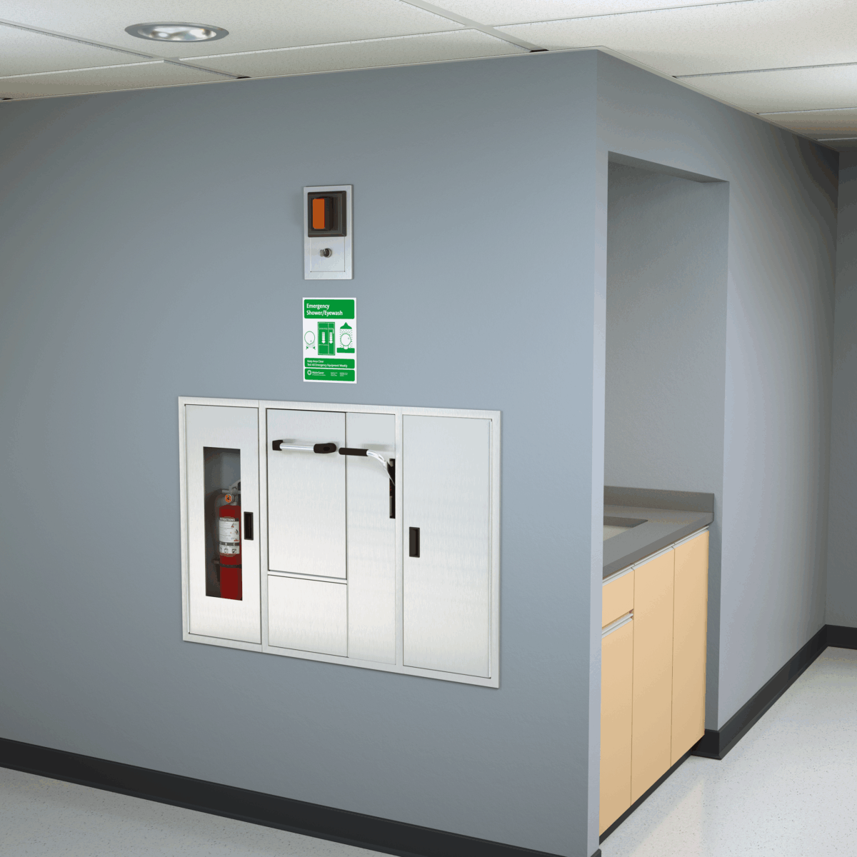 Application: Recessed safety center with barrier-free eye/face wash and shower safety station, matching fire extinguisher and right side storage housings, ceiling mounted recessed shower head, and drain pan. Stainless steel cover provides attractive appearance and protects unit when not in use. When activated, cover serves as pan to collect waste water and return it into unit for drainage. The integrated housings create a cohesive aesthetic for all safety equipment requirements in one location.
